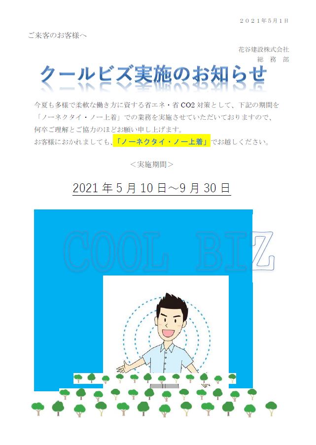 弊社では、地球環境温暖化防止や節電対策の一環として、今年もクールビズに取り組んでおります。下記の期間にて実施する事と致しますので、皆様のご理解とご協力をお願い致します。 <クールビズ概要> 実施期間:2021年5月10日~9月30日 期間中の服装について ノーネクタイ、ノー上着にて対応させて頂きます。 ※なお弊社をご訪問頂くお客様におかれましても、 ぜひ、「ノーネクタイ、ノー上着」でお越し下さい。