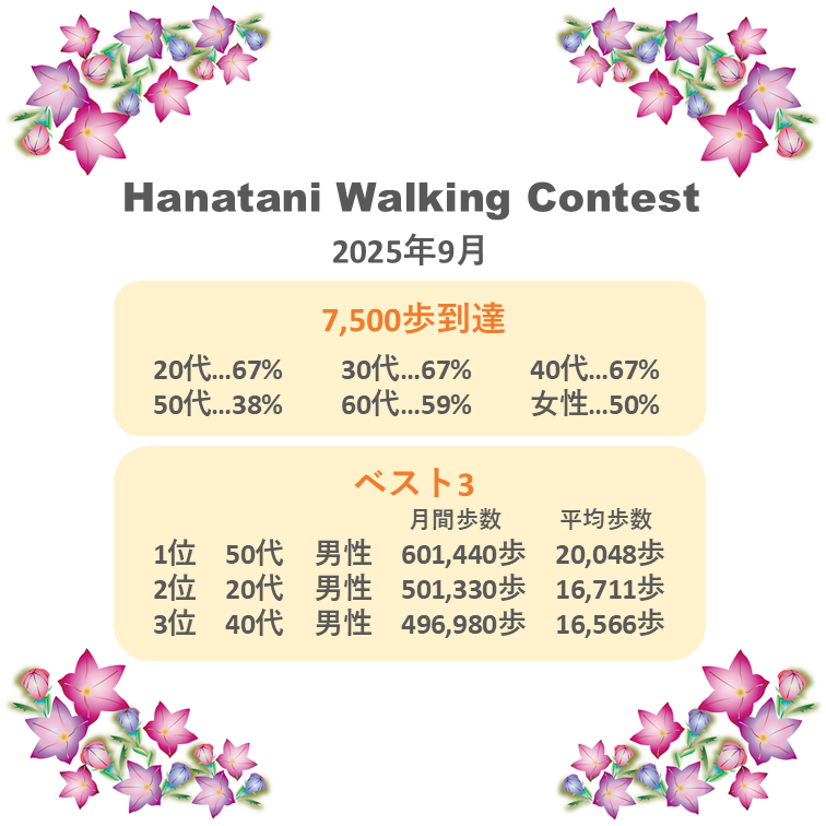 弊社では、健康増進の一環として様々な取り組みを行っています。 その一つに、63期Hanataniウォーキングコンテストを開催しています。 9月の集計結果で、7,500歩到達された方および1位から3位の方は以下の画像の通りです。 おめでとうございます。 引き続き、10月も行ってまいります。