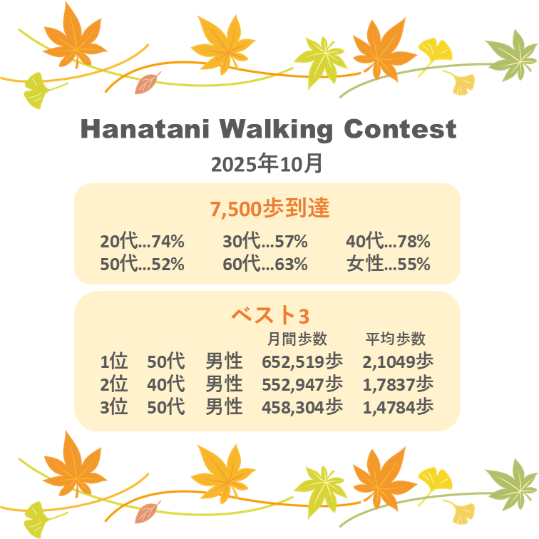 弊社では、健康増進の一環として様々な取り組みを行っています。 その一つに、63期Hanataniウォーキングコンテストを開催しています。 10月の集計結果で、7,500歩到達された方および1位から3位の方は以下の画像の通りです。 おめでとうございます。 引き続き、11月も行ってまいります。