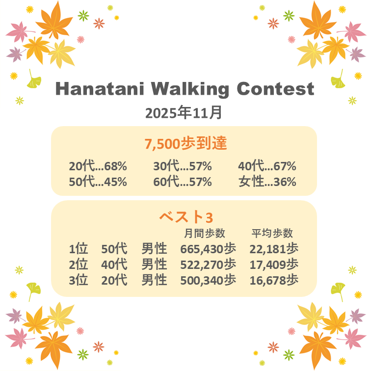 弊社では、健康増進の一環として様々な取り組みを行っています。 その一つに、63期Hanataniウォーキングコンテストを開催しています。 11月の集計結果で、7,500歩到達された方および1位から3位の方は以下の画像の通りです。 おめでとうございます。 引き続き、12月も行ってまいります。