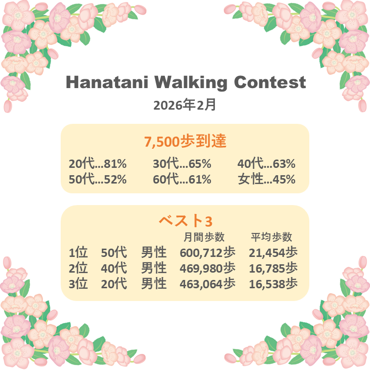 弊社では、健康増進の一環として様々な取り組みを行っています。 その一つに、63期Hanataniウォーキングコンテストを開催しています。 2月の集計結果で、7,500歩到達された方および1位から3位の方は以下の画像の通りです。 おめでとうございます。 引き続き、3月も行ってまいります。